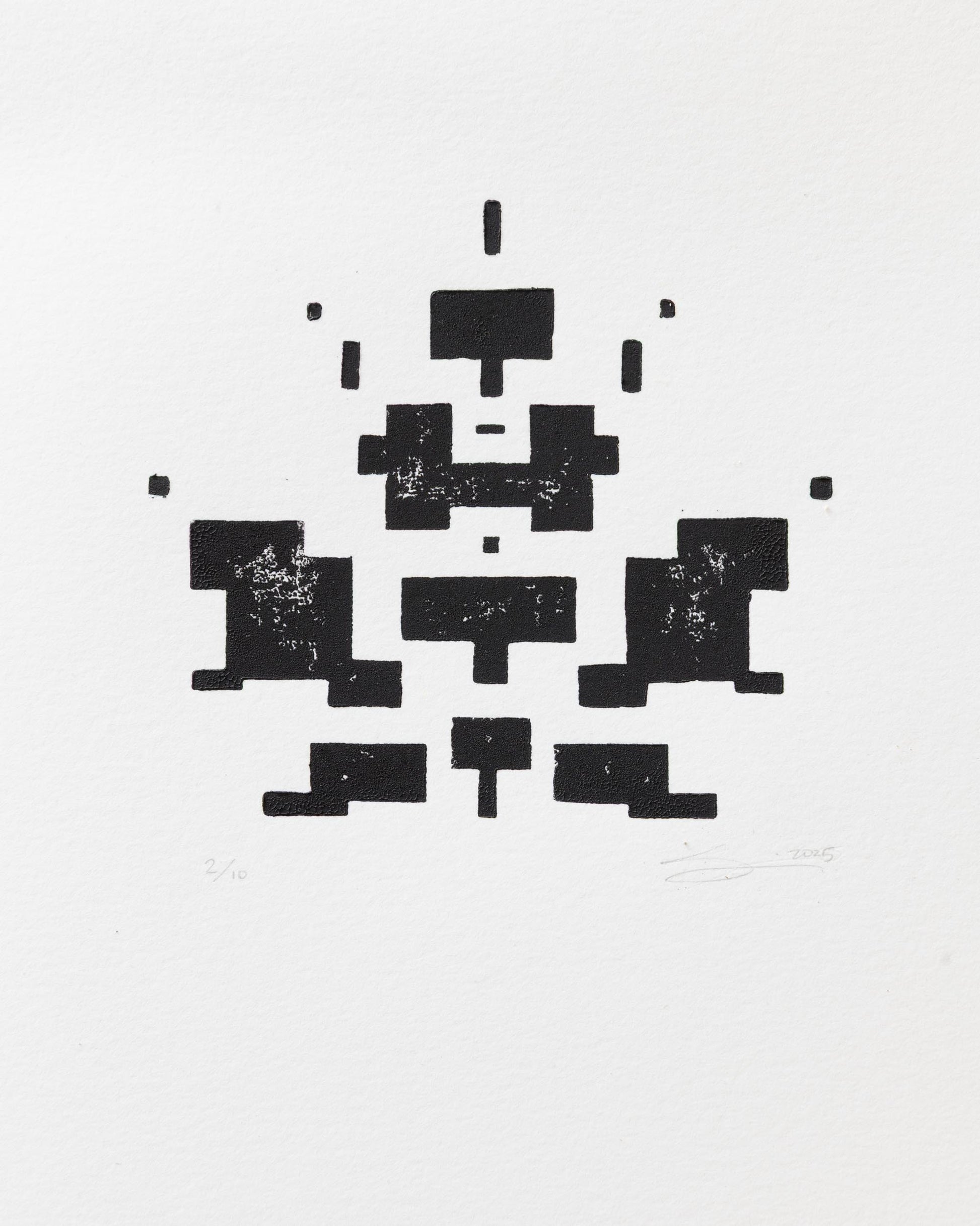 Print 2 of 10 in the edition. This limited edition of 10 prints interprets Fall's most symbolic element, the fallen leaf, in my geometric, schema style. Each print is an experiment with decay (similar to leaves losing color and decomposing) with varying organic patterns of inkless voids within the geometric design. In some prints, the graphics are nearly full black, others have voids in different areas and in varied amounts.