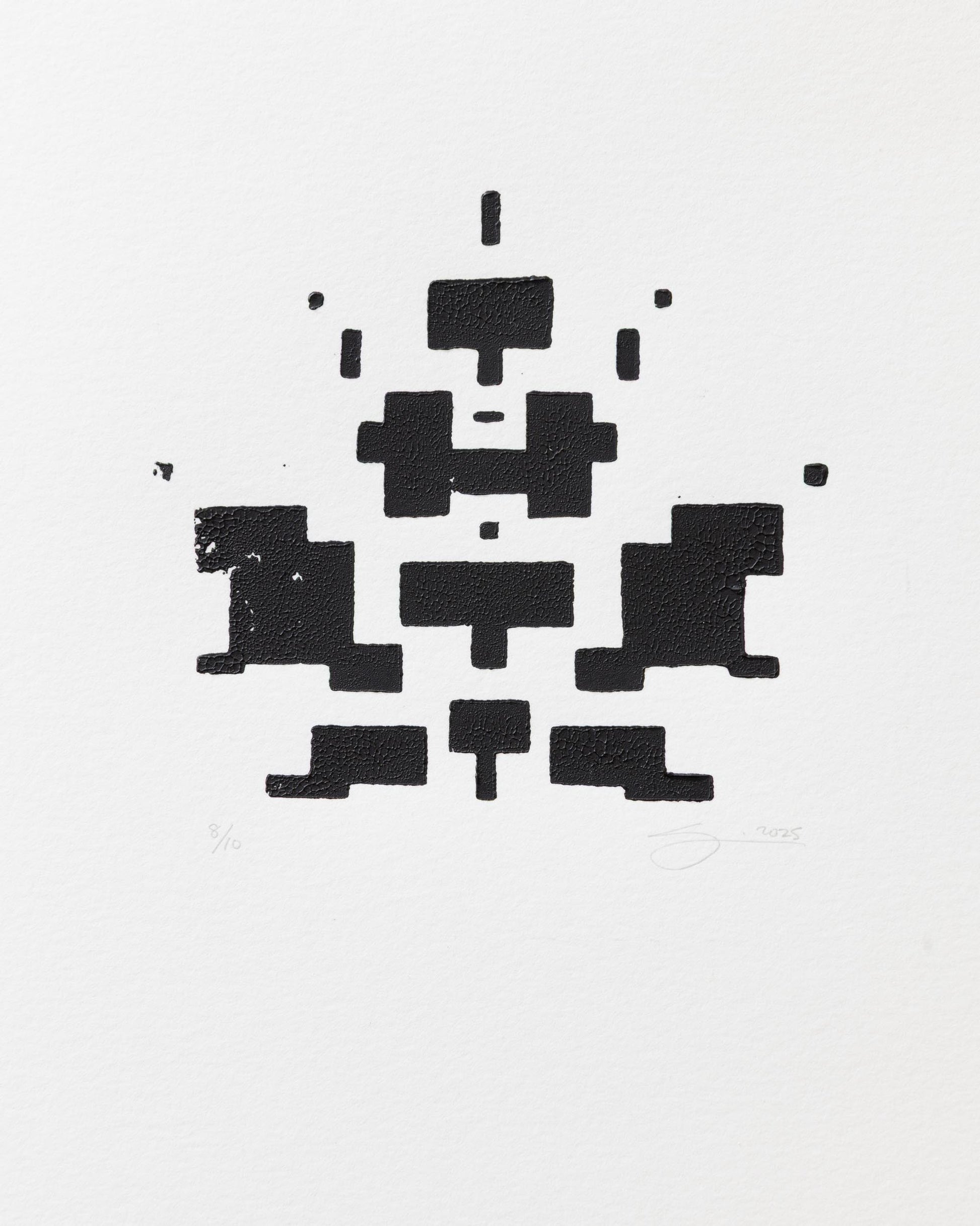 Print 3 of 10 in the edition. This limited edition of 10 prints interprets Fall's most symbolic element, the fallen leaf, in my geometric, schema style. Each print is an experiment with decay (similar to leaves losing color and decomposing) with varying organic patterns of inkless voids within the geometric design. In some prints, the graphics are nearly full black, others have voids in different areas and in varied amounts.