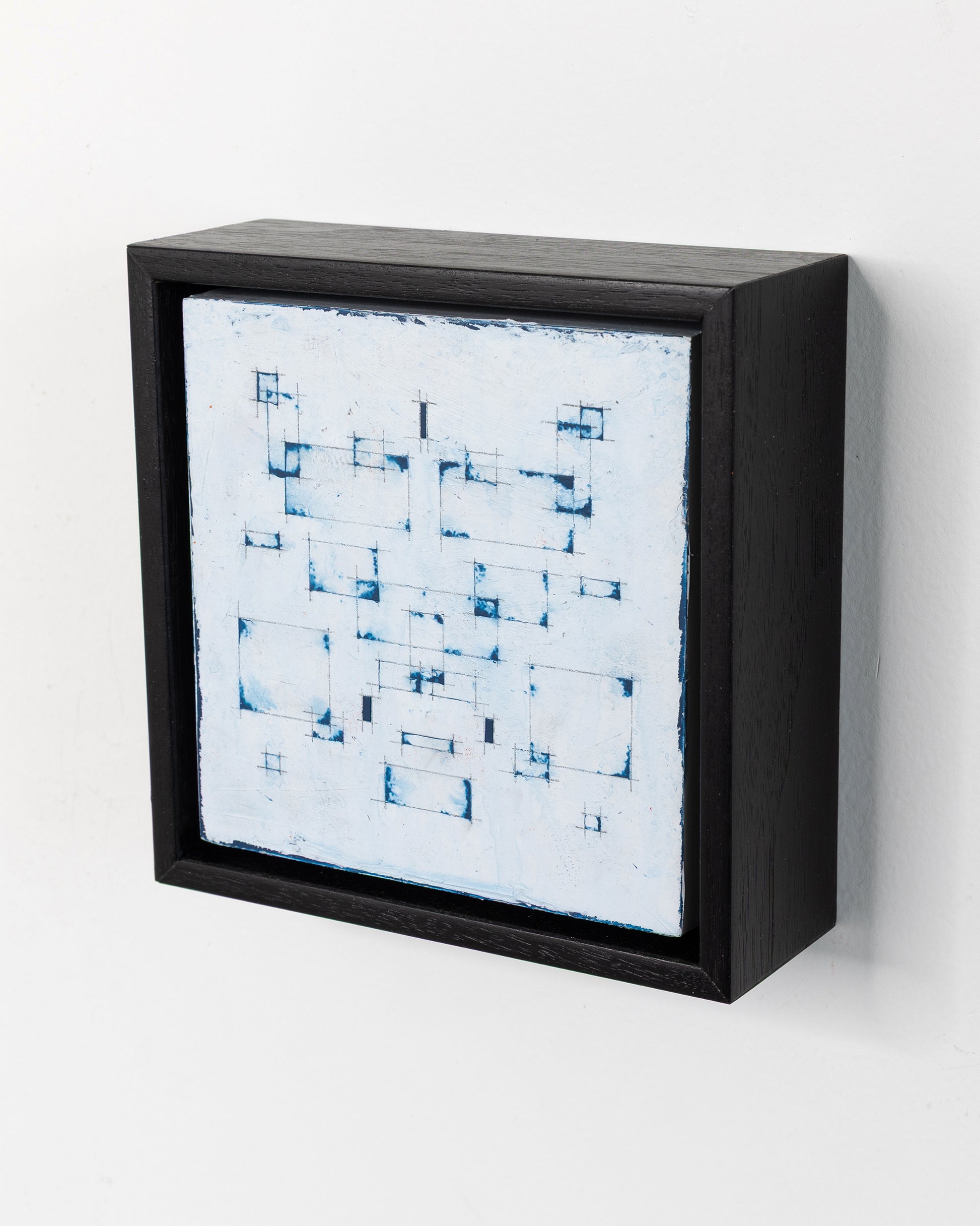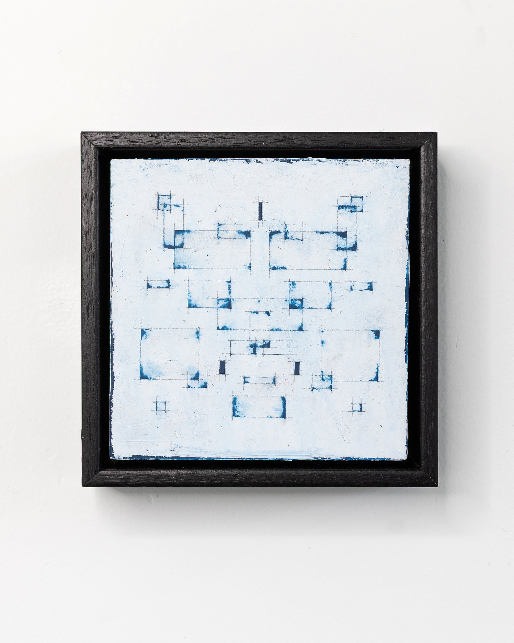 This abstract, framed, ready-to-hang acrylic painting is a "Moment" in my Schema collection. It's gentle, cool gray underpainting is full of depth and texture as a result of multiple semi-transparent under layers of pigment. An array of simple, precise, geometric, architectural acrylic elements are overlaid upon a detailed lattice of graphite line work evocative of an abstract architectural schematic. At 5x5 inches, Moments are small, but memorable and can be displayed as singles, or grouped together in multiples.