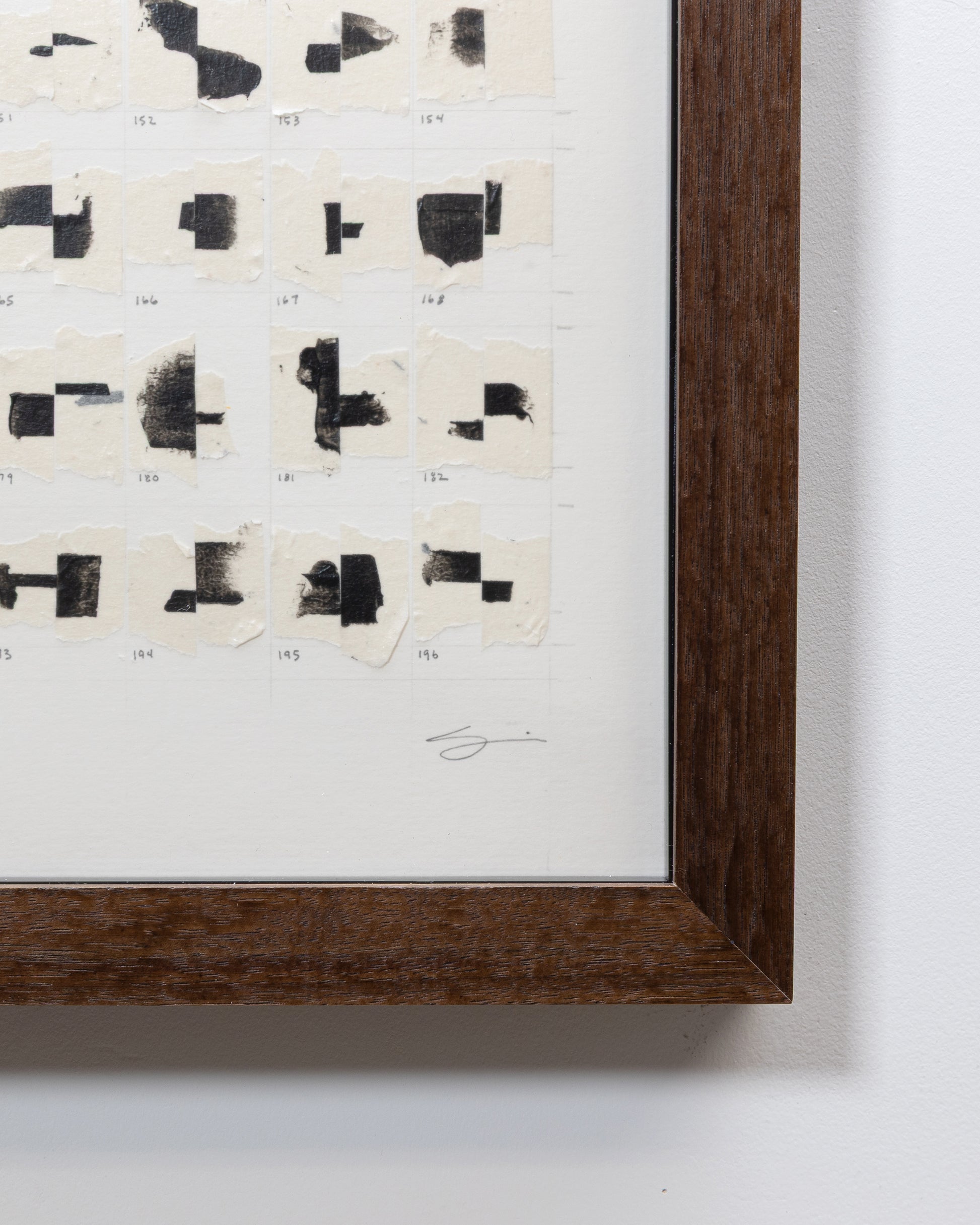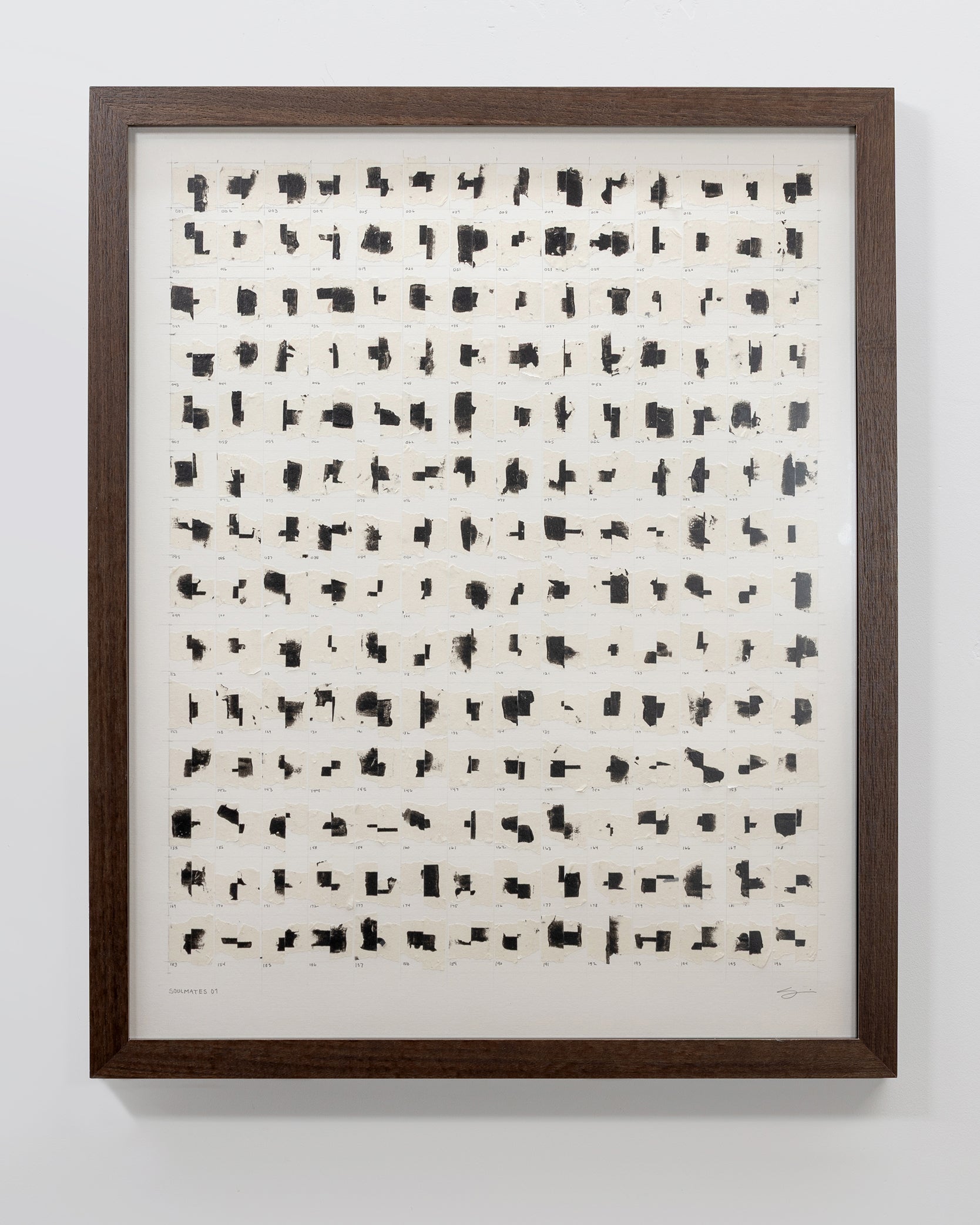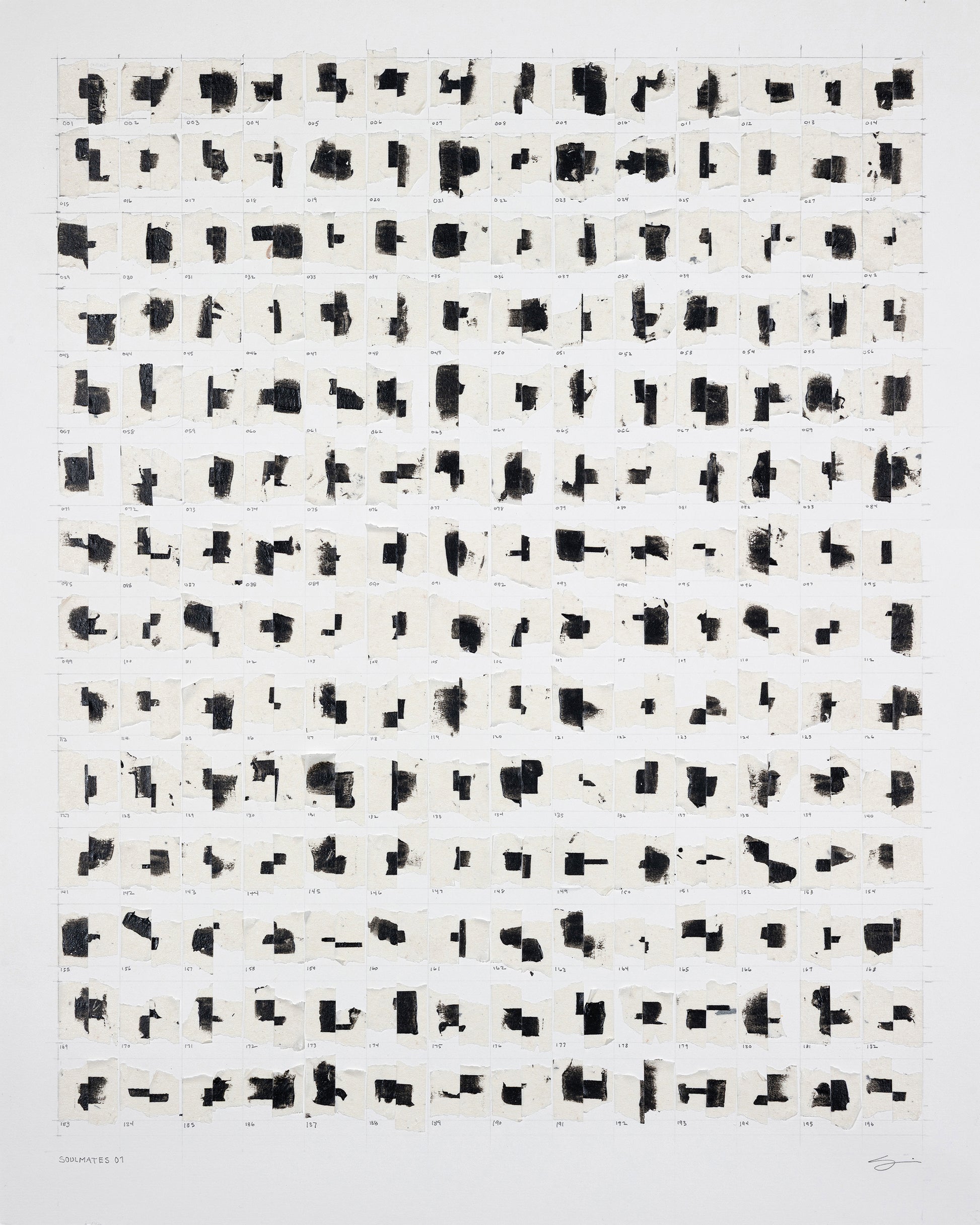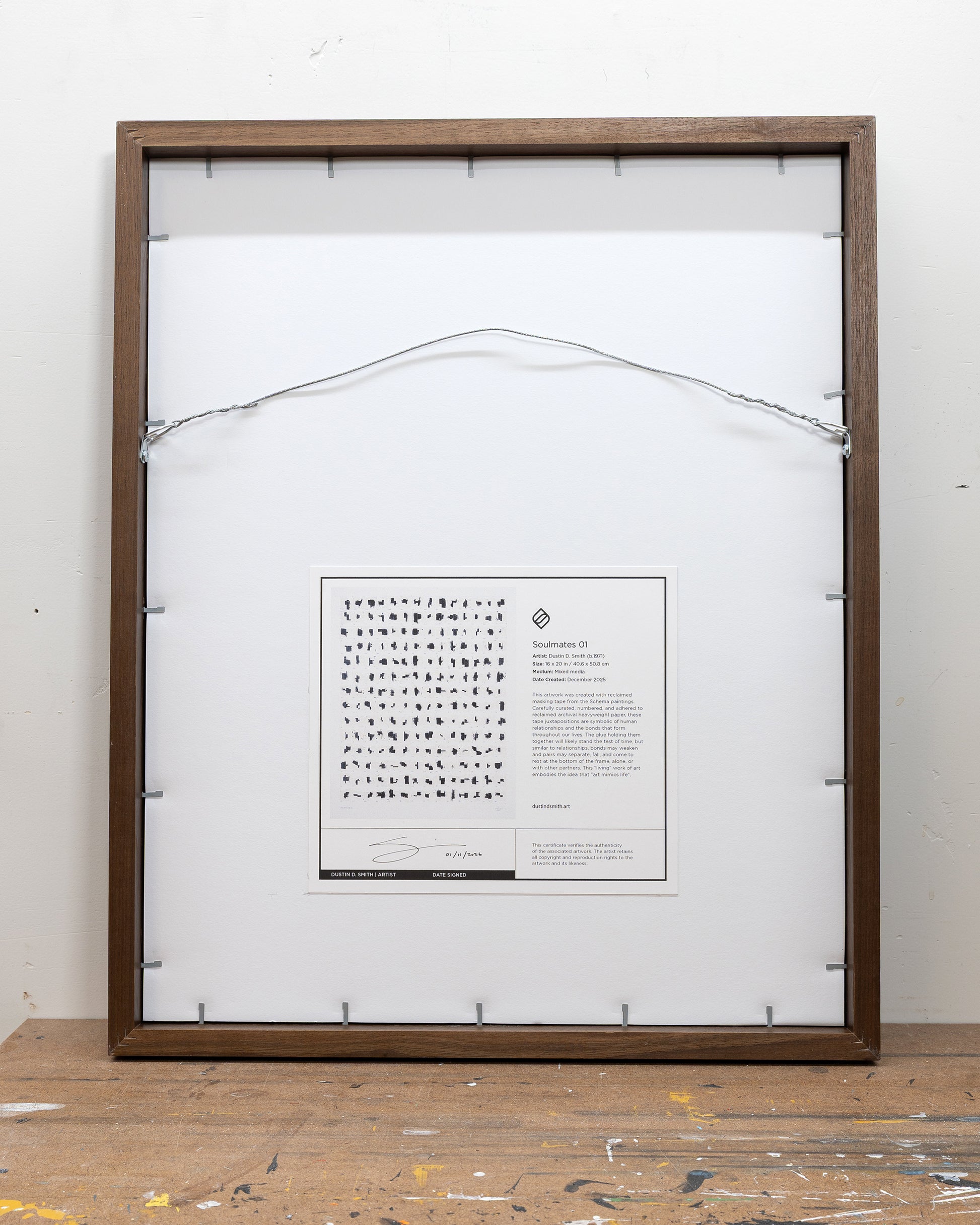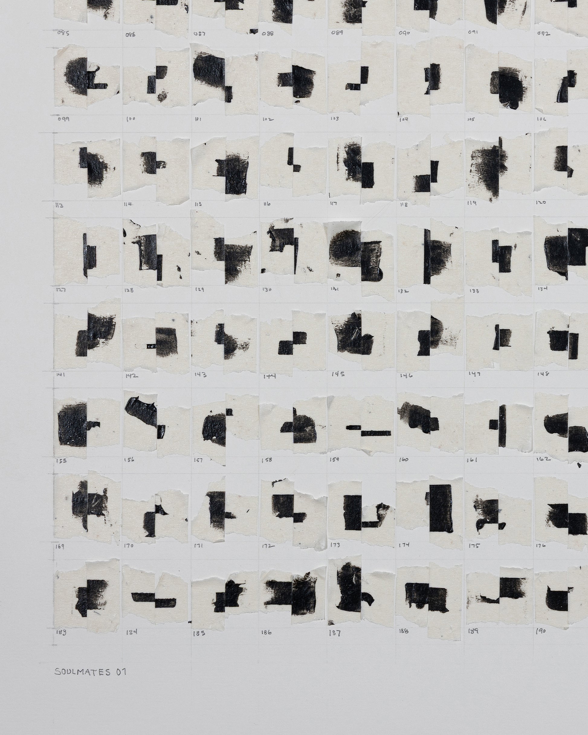 Carefully curated, numbered, and adhered to reclaimed archival heavyweight paper, these tape juxtapositions are symbolic of human relationships and the bonds that form throughout our lives. The glue holding them together will likely stand the test of time, but similar to relationships, bonds may weaken and pairs may separate, fall, and come to rest at the inside bottom of the frame, alone, or with other partners. This “living” work of art embodies the idea that "art mimics life".