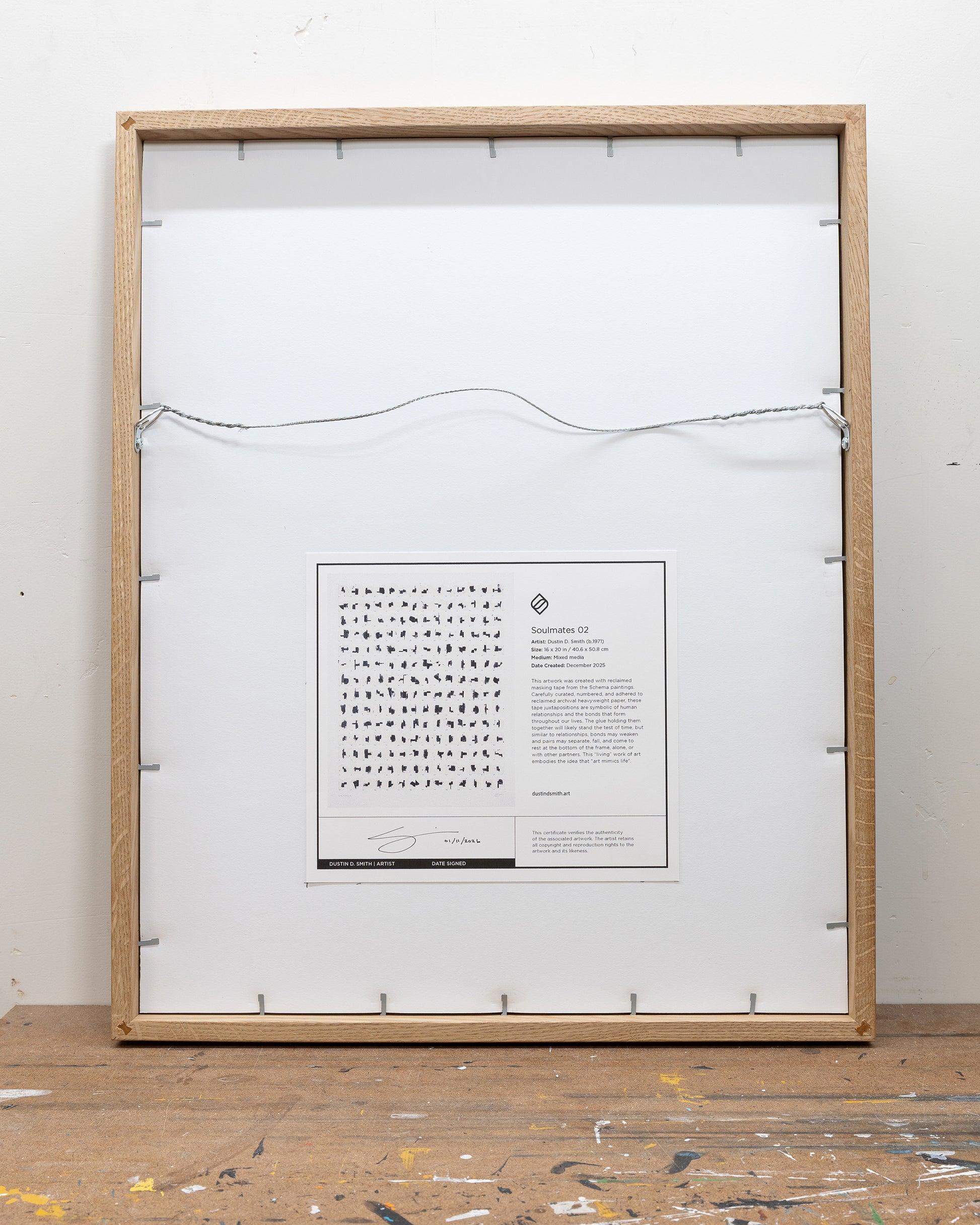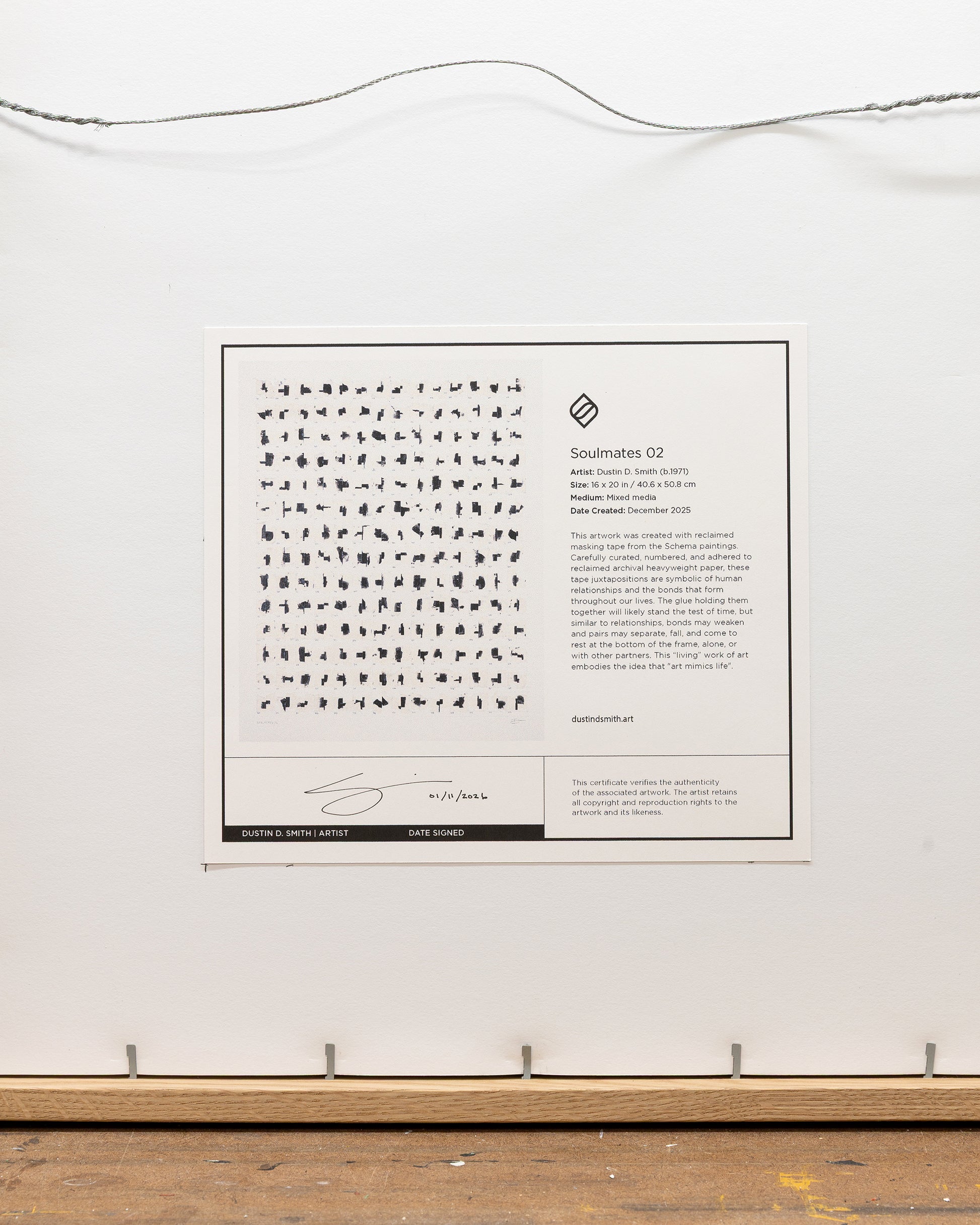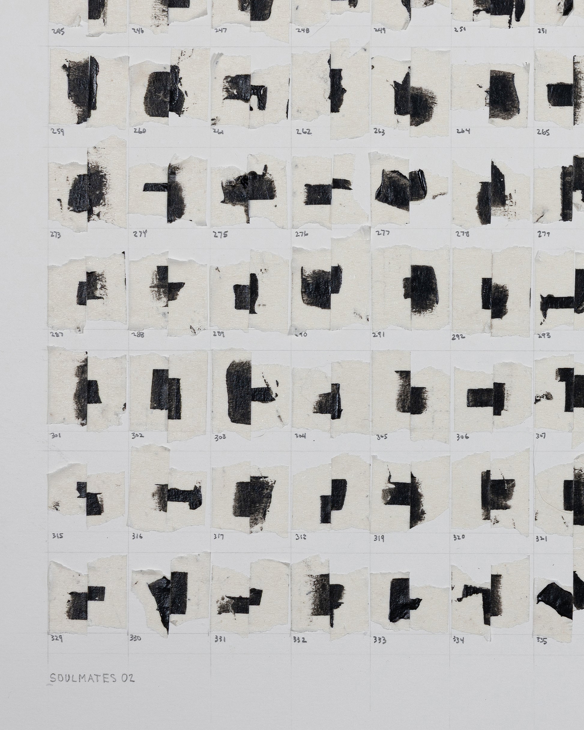 Carefully curated, numbered, and adhered to reclaimed archival heavyweight paper, these tape juxtapositions are symbolic of human relationships and the bonds that form throughout our lives. The glue holding them together will likely stand the test of time, but similar to relationships, bonds may weaken and pairs may separate, fall, and come to rest at the inside bottom of the frame, alone, or with other partners. This “living” work of art embodies the idea that "art mimics life".