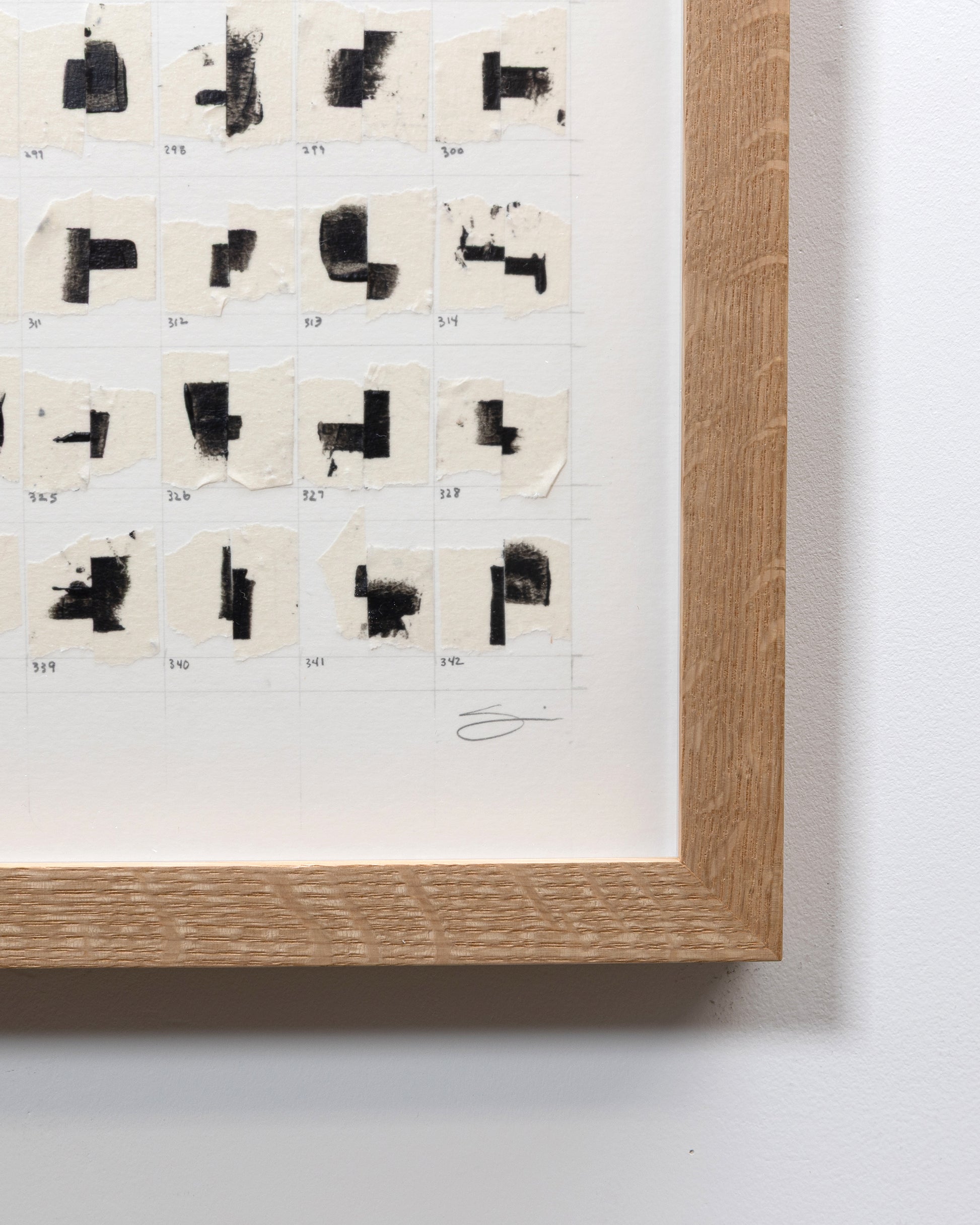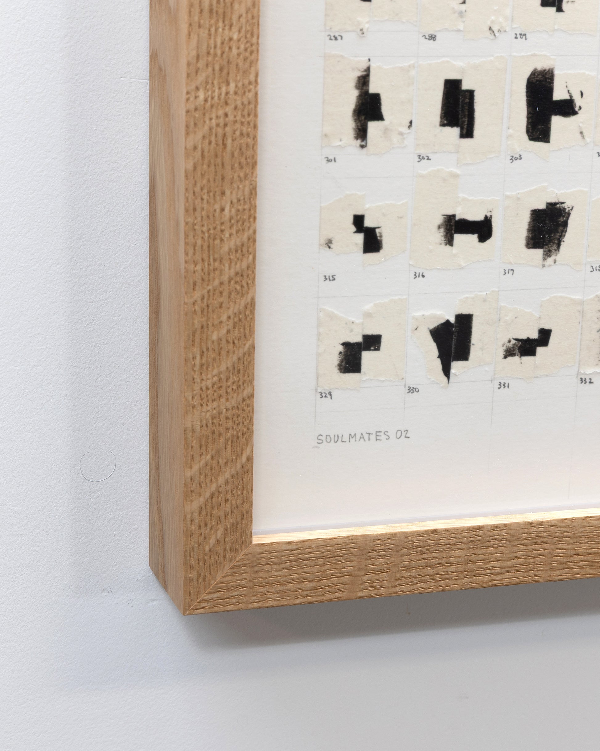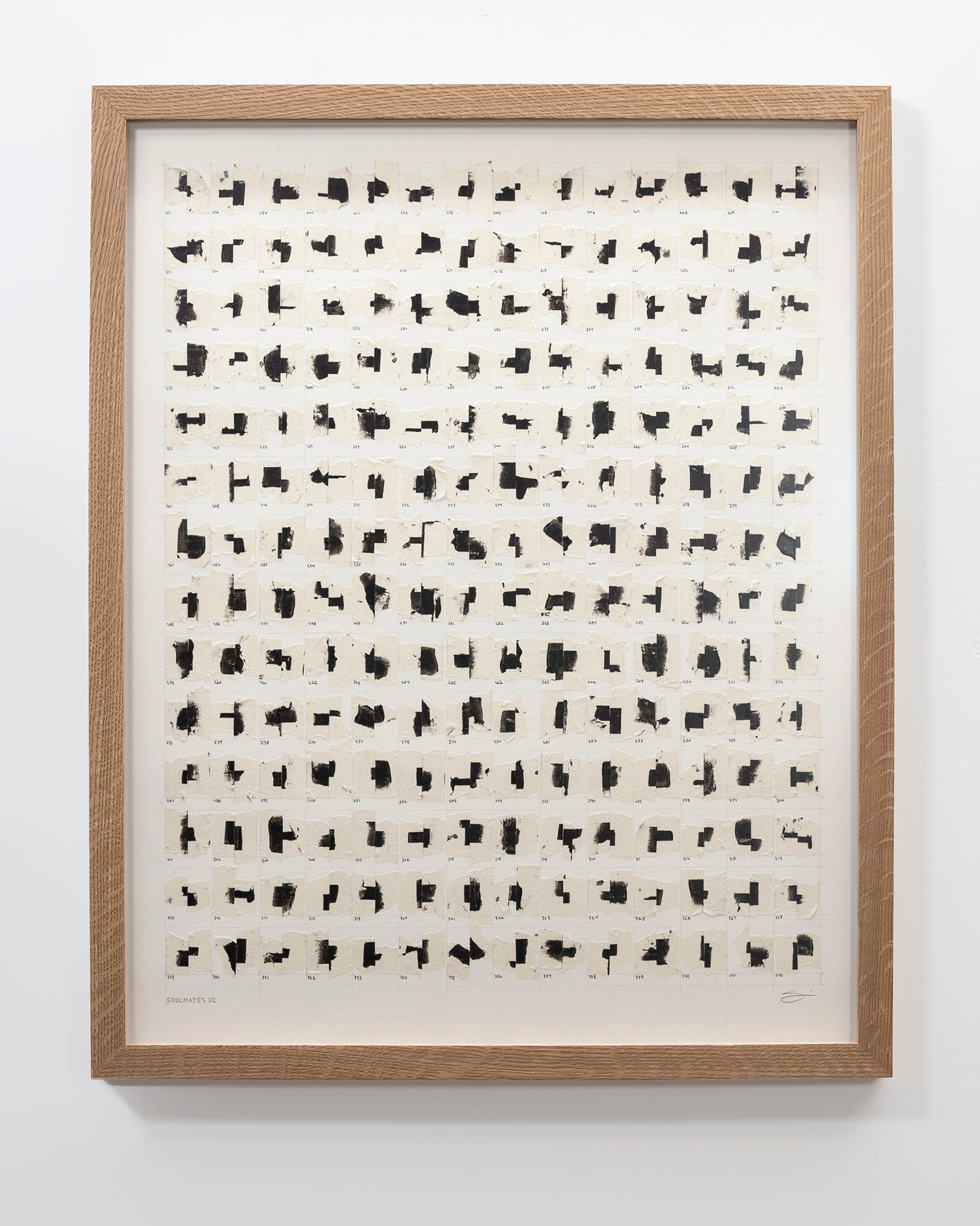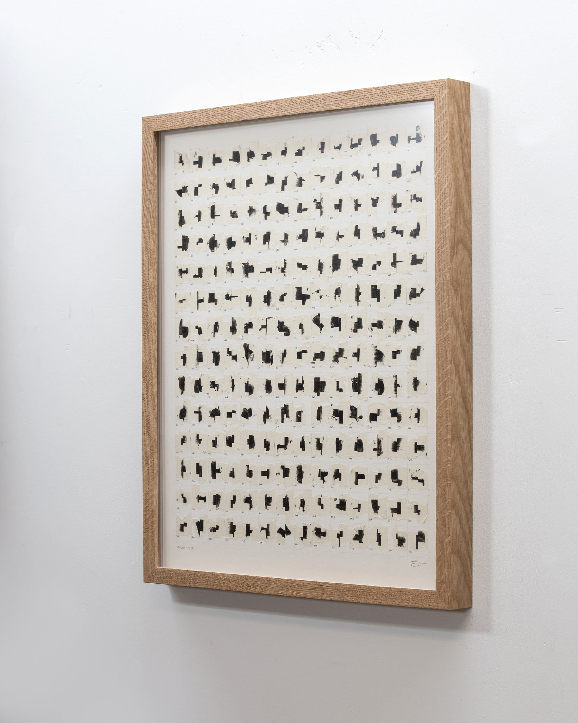 Carefully curated, numbered, and adhered to reclaimed archival heavyweight paper, these tape juxtapositions are symbolic of human relationships and the bonds that form throughout our lives. The glue holding them together will likely stand the test of time, but similar to relationships, bonds may weaken and pairs may separate, fall, and come to rest at the inside bottom of the frame, alone, or with other partners. This “living” work of art embodies the idea that "art mimics life".