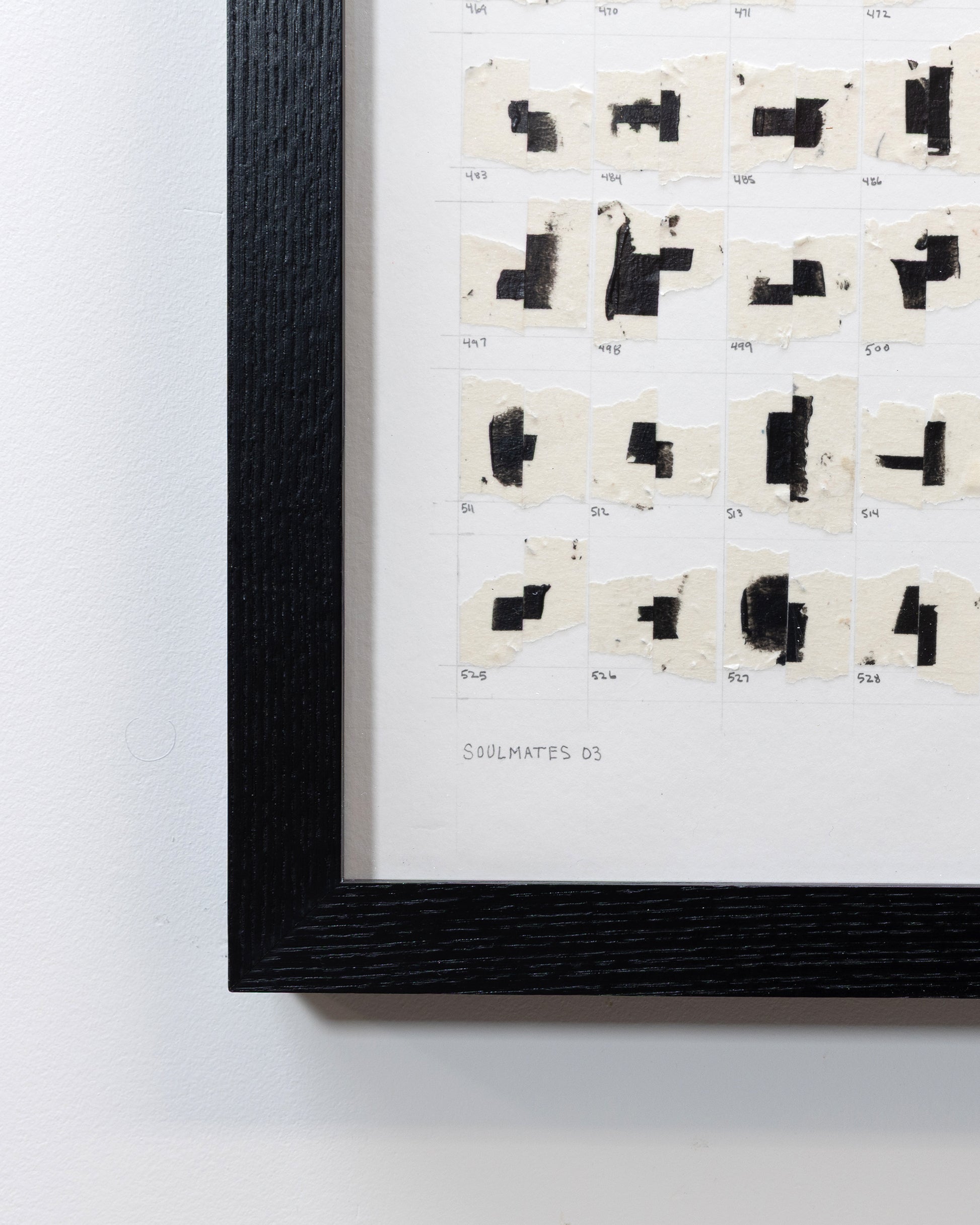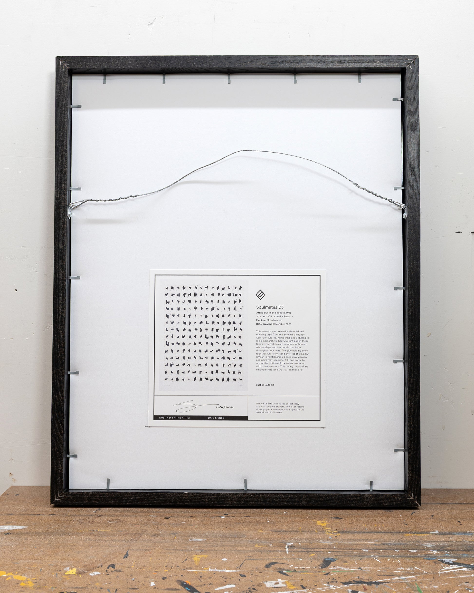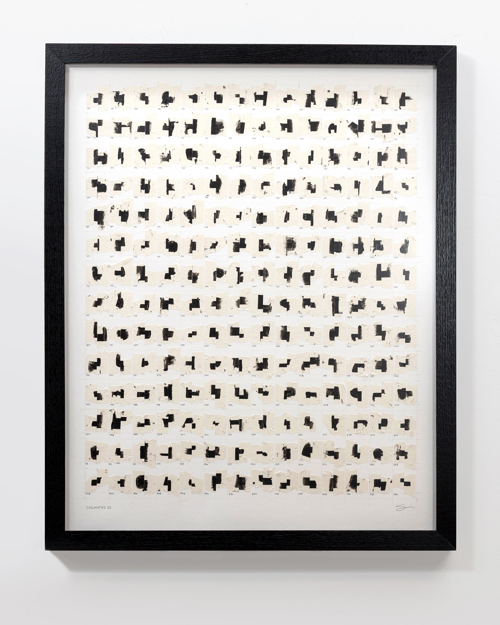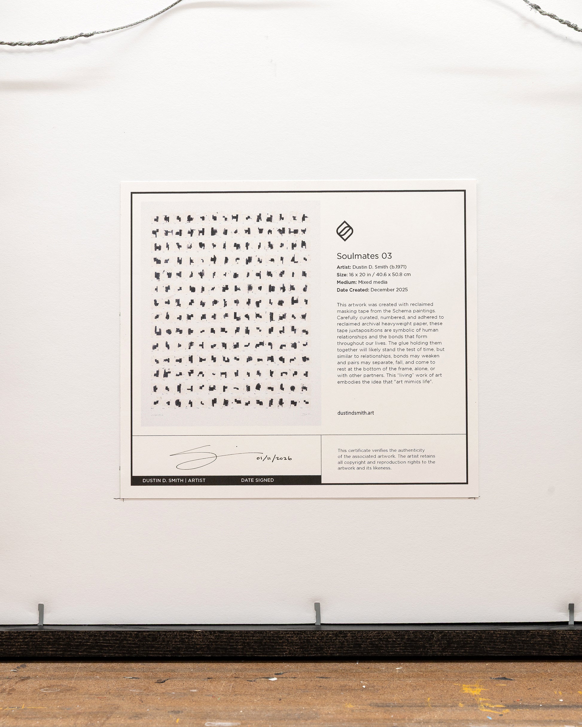 Carefully curated, numbered, and adhered to reclaimed archival heavyweight paper, these tape juxtapositions are symbolic of human relationships and the bonds that form throughout our lives. The glue holding them together will likely stand the test of time, but similar to relationships, bonds may weaken and pairs may separate, fall, and come to rest at the inside bottom of the frame, alone, or with other partners. This “living” work of art embodies the idea that "art mimics life".