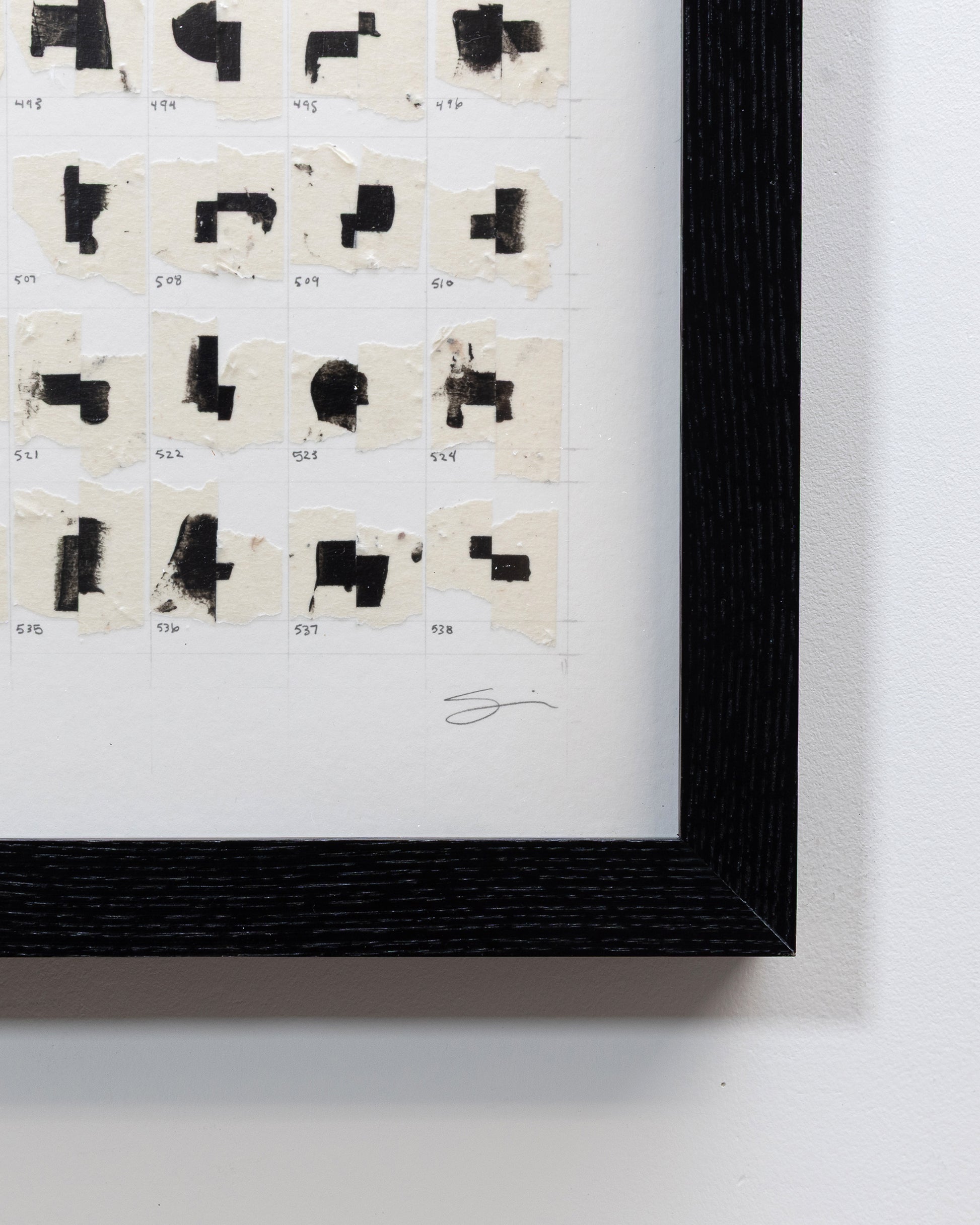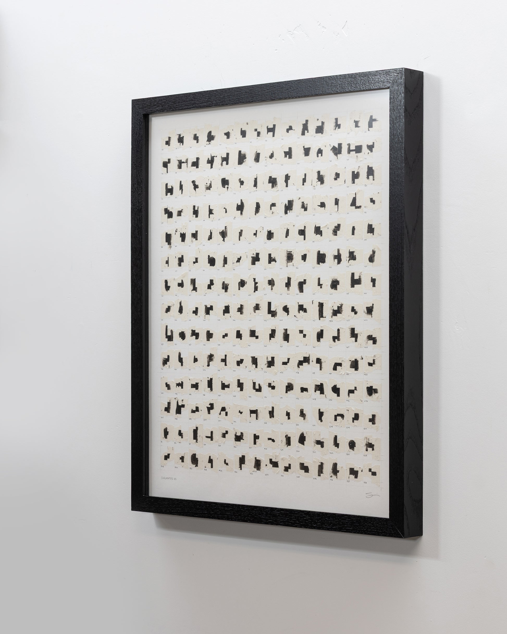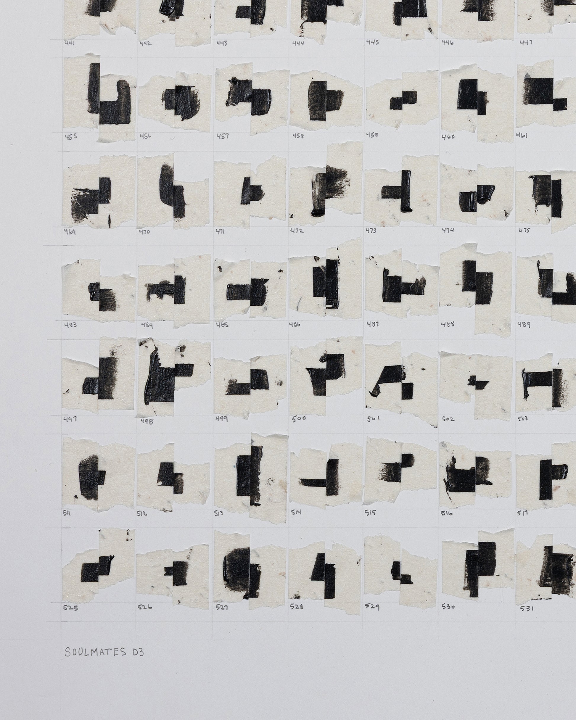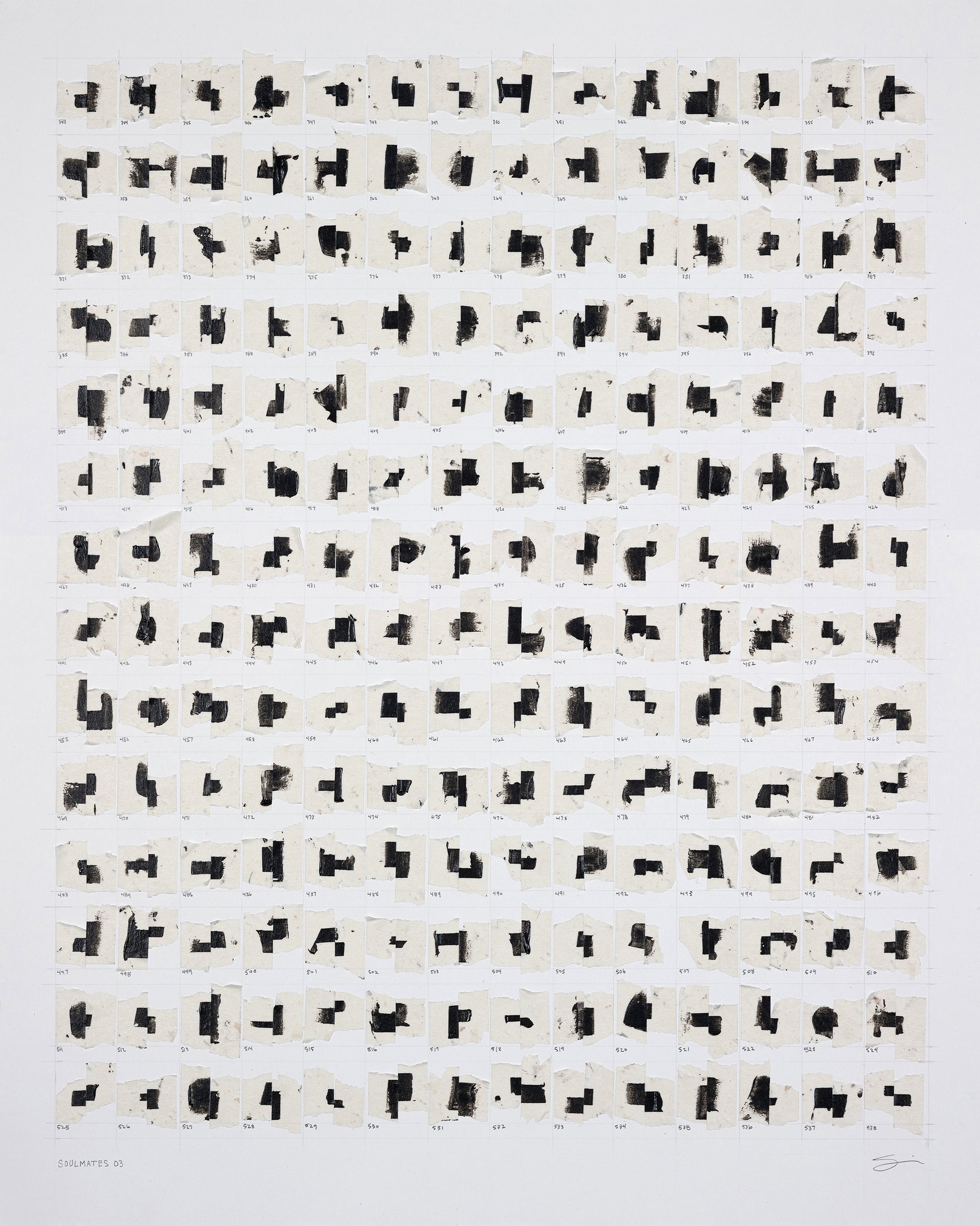 Carefully curated, numbered, and adhered to reclaimed archival heavyweight paper, these tape juxtapositions are symbolic of human relationships and the bonds that form throughout our lives. The glue holding them together will likely stand the test of time, but similar to relationships, bonds may weaken and pairs may separate, fall, and come to rest at the inside bottom of the frame, alone, or with other partners. This “living” work of art embodies the idea that "art mimics life".